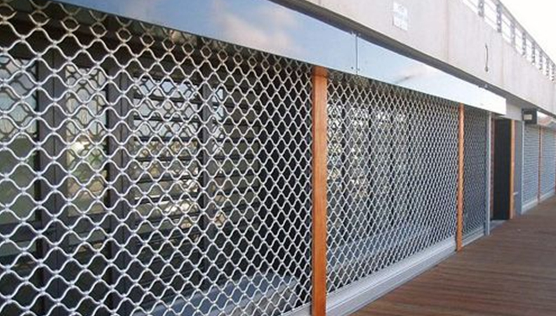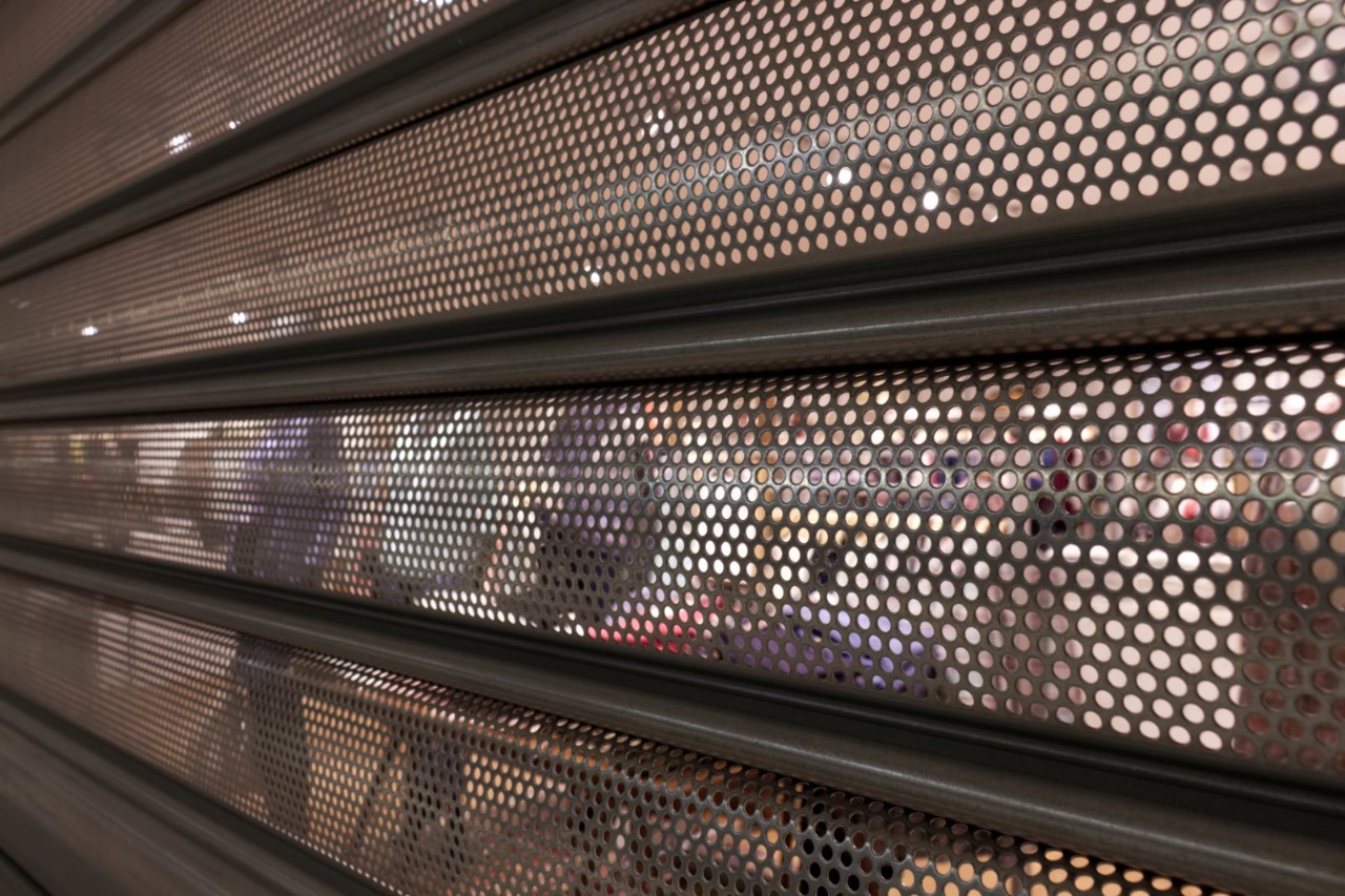 Solution intermédiaire entre le rideau à grille métallique en tubes ondulés et le rideau métallique à grille pleine, le rideau à lames micro-perforées conserve la solidité de la grille pour une sécurité maximale, en permettant cependant de présenter les articles après les heures de fermetures.